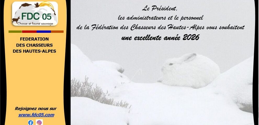 Le Président, les administrateurs et le personnel de la Fédération des Chasseurs des Hautes-Alpes vous souhaitent une excellente année 2026 ! Pour voir la carte de voeux de la FDC 05, cliquez ici.TweetezÉpinglePartagez